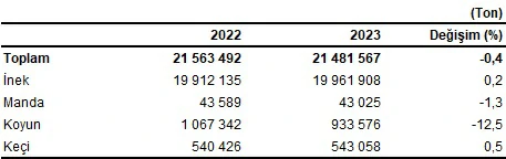 Çiğ süt üretim istatistikleri 2020 yılından itibaren Tarımsal İşletmelerde Hayvansal Üretim Araştırması’ndan elde edilmektedir. Buna göre, 2022 yılında 21 milyon 563 bin 492 ton olan çiğ süt üretim tahmini, 2023 yılında %0,4 azalarak 21 milyon 481 bin 567 ton oldu. Bir önceki yıla göre keçi sütü üretimi %0,5, inek sütü üretimi %0,2 artarken, koyun sütü üretimi %12,5 ve manda sütü üretimi %1,3 azaldı.