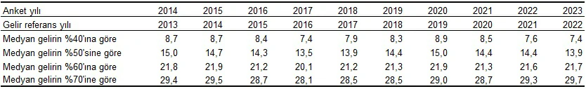 Toplumun genel düzeyine göre belirli bir sınırın altında gelire sahip olan bireyler göreli anlamda yoksul sayılmaktadır. Eşdeğer hanehalkı kullanılabilir fert medyan gelirinin %50’si dikkate alınarak belirlenen yoksulluk sınırına göre, yoksulluk oranı 2023 yılında 0,5 puan azalarak %13,9 oldu. Medyan gelirin %60’ı dikkate alınarak belirlenen yoksulluk sınırına göre hesaplanan yoksulluk oranı ise son yılda 0,1 puan artarak %21,7 olarak gerçekleşti.