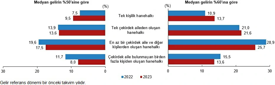Hanehalkı tipine göre eşdeğer hanehalkı kullanılabilir fert medyan gelirinin %50’si dikkate alınarak hesaplanan yoksulluk oranlarına bakıldığında; çekirdek aile bulunmayan birden fazla kişiden oluşan hanehalklarında yoksulluk oranı bir önceki yıla göre 3,7 puan azalarak %8,0, tek kişilik hanehalklarında ise 2,0 puan artarak %9,5 olmuştur. En az bir çekirdek aile ve diğer kişilerden oluşan hanehalklarının yoksulluk oranı 2,1 puan azalarak %17,5, tek çekirdek aileden oluşan hanehalklarının yoksulluk oranı ise 0,3 puan azalarak %13,6 oldu.