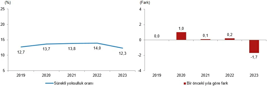 Dört yıllık panel veri kullanılarak hesaplanan sürekli yoksulluk oranı, eşdeğer hanehalkı kullanılabilir fert medyan gelirinin %60’ına göre son yılda ve aynı zamanda önceki üç yıldan en az ikisinde de yoksul olan fertleri kapsamaktadır. Buna göre, 2023 yılı anket sonuçlarına göre sürekli yoksulluk oranı bir önceki yıla göre 1,7 puan azalarak %12,3 oldu.