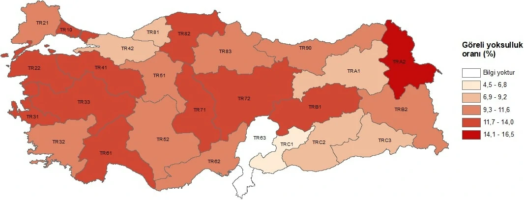 İBBS 2. Düzey bölgelerinin her biri için eşdeğer hanehalkı kullanılabilir fert medyan gelirinin yüzde 50’sine göre hesaplanan yoksulluk sınırına göre, gelire dayalı göreli yoksulluk oranının en yüksek olduğu bölgeler; %16,1 ile TRA2 (Ağrı, Kars, Iğdır, Ardahan), %14,0 ile TR41 (Bursa, Eskişehir, Bilecik) ve %13,9 ile TR82 (Kastamonu, Çankırı, Sinop) oldu.