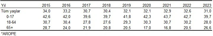 Son yıl sonuçlarına göre fertlerin %31,0’ı yoksulluk veya sosyal dışlanma riski altında kaldı. Bu oran yaş gruplarına göre incelendiğinde; 0-17 yaş grubunda %39,7, 18-64 yaş grubunda %28,0, 65 ve üstü yaş grubunda ise %26,6 olarak tahmin edildi.