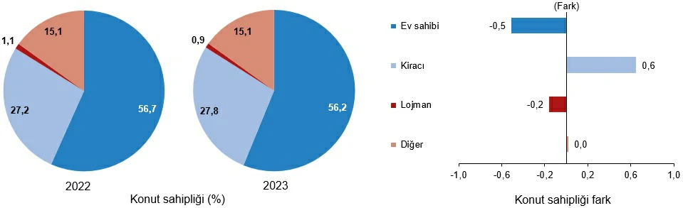 Konut sahipliği dağılımı ve bir önceki yıla göre fark, 2022, 2023
