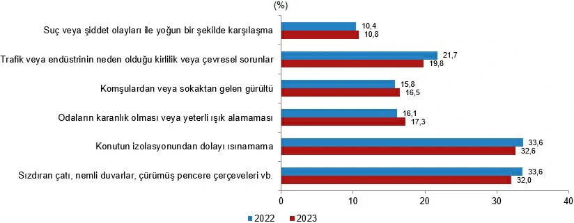 Kurumsal olmayan nüfusun %32,6’sı konutunda izolasyondan dolayı ısınma sorunu yaşarken %32,0’ı ise sızdıran çatı, nemli duvarlar, çürümüş pencere çerçeveleri vb. problemlerle, %19,8’i trafik veya endüstrinin neden olduğu hava kirliliği, çevre kirliliği veya diğer çevresel sorunlarla karşılaştı.