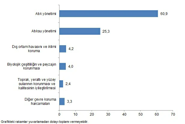 Çevre koruma harcamalarının %60,9’u atık yönetimi hizmetlerinden, %25,3’ü atıksu yönetimi hizmetlerinden, %4,2’si dış ortam havasını ve iklimi korumadan, %4’ü biyolojik çeşitliliğin ve peyzajın korunmasından, %2,4’ü toprak, yeraltı ve yüzey sularının korunması ve kalitesinin iyileştirilmesinden ve %3,3’ü ise diğer çevre koruma konularından oluştu.