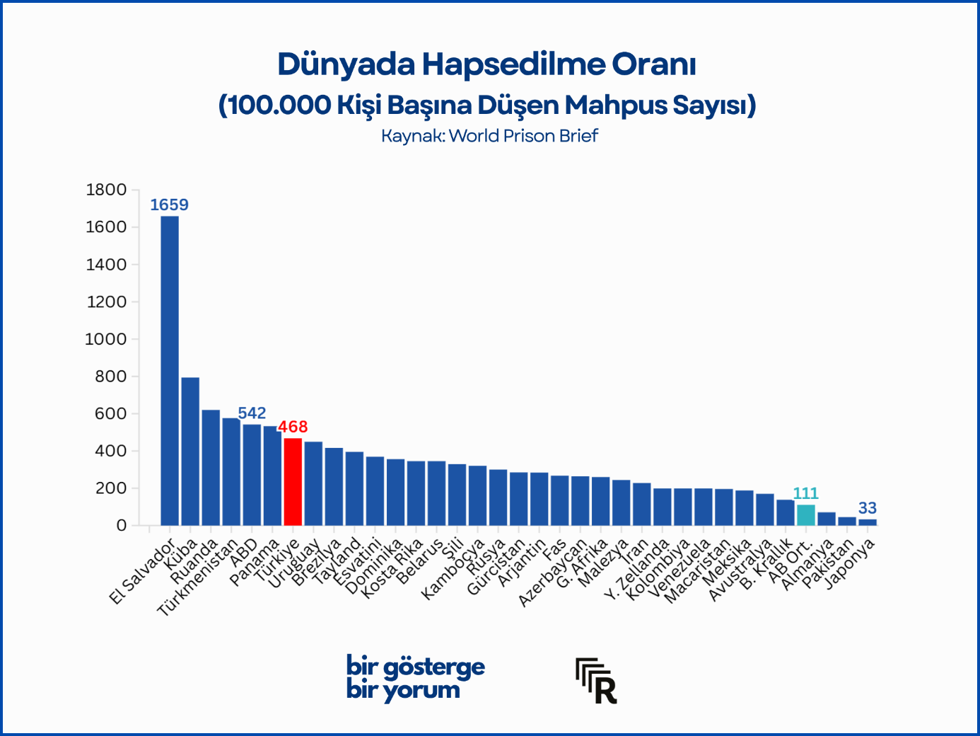 Listenin başındaki ülkeler El Salvador, Küba, Ruanda, Türkmenistan ve ABD. Türkiye, ABD’den sonra bu oranın en yüksek olduğu OECD ülkesi konumunda. Bu oran, AB ortalamasının yaklaşık dört katına denk geliyor.