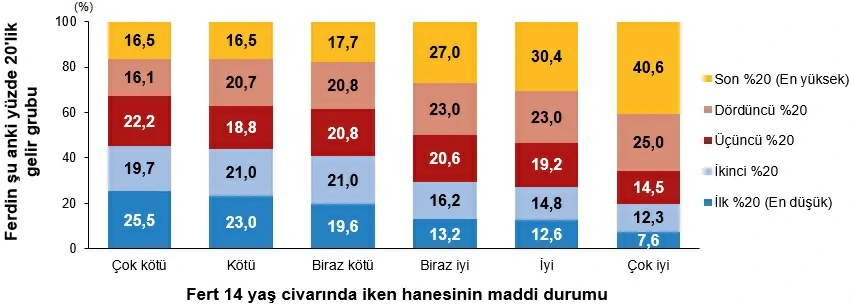 Kendisi 14 yaş civarında iken ailesinin maddi durumunu “çok kötü” olarak belirtenlerin %16,5’i şu an en yüksek yüzde 20’lik gelir grubunda yer alırken, %25,5’i ise en düşük grupta yer aldı. Kendisi 14 yaş civarında iken ailesinin maddi durumunu “çok iyi” olarak belirtenlerin %40,6’sı şu an en yüksek gelir grubunda iken %7,6’sı ise en düşük grupta oldu.