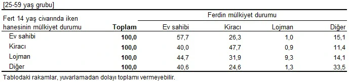 Görüşülen fertler 14 yaş ve civarında iken ailesi “ev sahibi” olanların, %57,7’sinin şu an oturduğu konutta mülkiyet durumu “ev sahibi”, %26,3’ünün ise “kiracı” olduğu tahmin edildi. Yine fert 14 yaş civarında iken mülkiyet durumu “kiracı” olanların, %40,0’ı şu an oturduğu konutun sahibi iken %47,7’sinin ise kirada oturduğu görüldü.