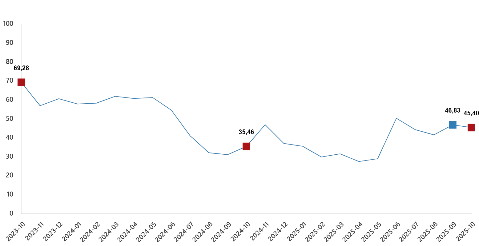 Tarım-ÜFE’de (2020=100), 2025 yılı Ekim ayında bir önceki aya göre %4,00 artış, bir önceki yılın Aralık ayına göre %34,06 artış, bir önceki yılın aynı ayına göre %45,40 artış ve on iki aylık ortalamalara göre %38,83 artış gerçekleşti.