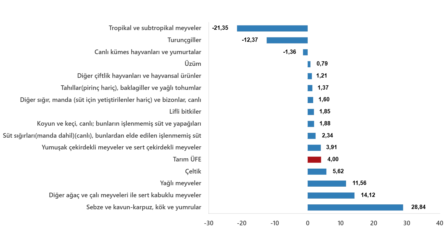 Sektörlerde bir önceki aya göre, tarım ve avcılık ürünleri ve ilgili hizmetlerde %4,13 artış, ormancılık ürünleri ve ilgili hizmetlerde %2,35 artış ve balık ve diğer balıkçılık ürünleri; su ürünleri; balıkçılık için destekleyici hizmetlerde %1,84 artış gerçekleşti. Ana gruplarda bir önceki aya göre, tek yıllık (uzun ömürlü olmayan) bitkisel ürünlerde %12,00 artış, çok yıllık (uzun ömürlü) bitkisel ürünlerde %1,32 azalış ve canlı hayvanlar ve hayvansal ürünlerde %1,75 artış gerçekleşti.