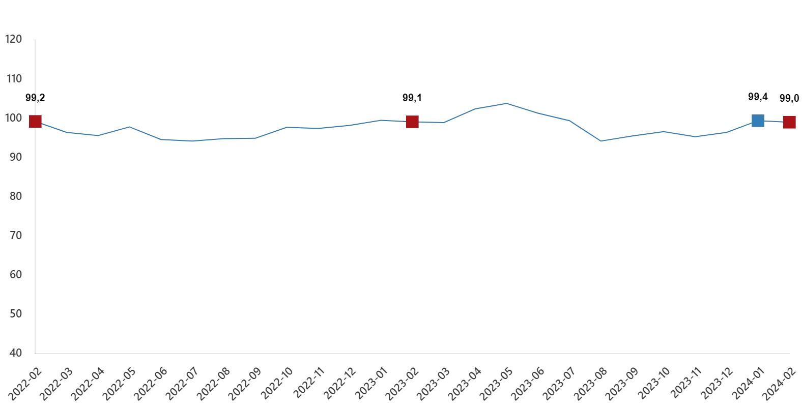Ekonomik güven endeksi Ocak ayında 99,4 iken, Şubat ayında %0,4 oranında azalarak 99,0 değerini aldı.