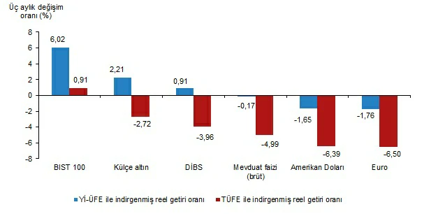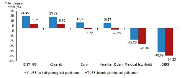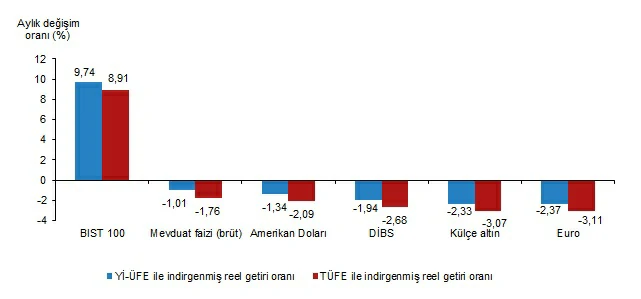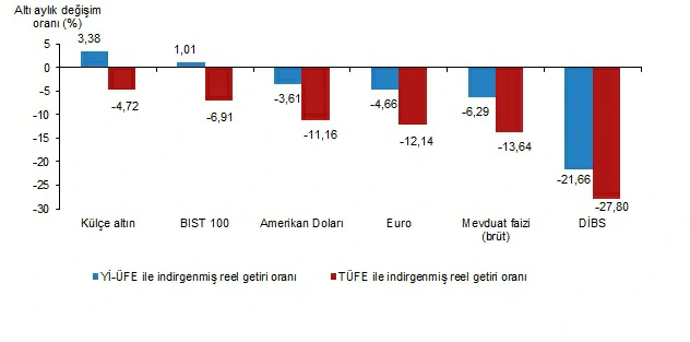 Yİ-ÜFE ile indirgendiğinde; yatırım araçlarından mevduat faizi (brüt) %1,01, Amerikan Doları %1,34, Devlet İç Borçlanma Senetleri (DİBS) %1,94, külçe altın %2,33 ve Euro %2,37 oranlarında yatırımcısına kaybettirdi. TÜFE ile indirgendiğinde; mevduat faizi (brüt) %1,76, Amerikan Doları %2,09, DİBS %2,68, külçe altın %3,07 ve Euro %3,11 oranlarında yatırımcısına kaybettirdi.