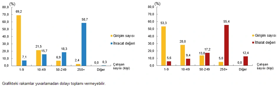 Hizmet ithalatı yapan girişimlerin %53,3’ünü oluşturan 1-9 çalışanı olan mikro ölçekli girişimler, hizmet ithalatının %5,6’sını yaptı. Çalışan sayısı 10-49 kişi olan küçük ölçekli girişimlerin hizmet ithalatındaki payı %9,4 olurken 50-249 kişi olan orta ölçekli girişimlerin payı %17,2 oldu. Hizmet ithalatının %55,4’ünü, hizmet ithalatı yapan girişimlerin %5,0’ını oluşturan 250 ve daha fazla kişinin çalıştığı büyük ölçekli girişimler gerçekleştirdi.