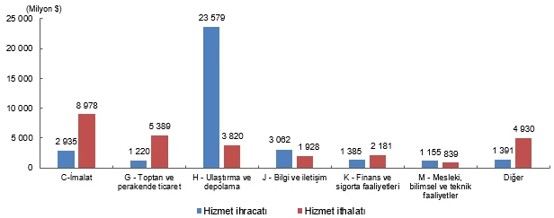 Hizmet ticaretinde 28 milyar 64 milyon dolarlık ithalatın 8 milyar 978 milyon doları imalat sanayinde faaliyet gösteren girişimler tarafından yapıldı. Hizmet ithalatındaki 5 milyar 389 milyon dolar, ana faaliyeti toptan ve perakende ticaret olan girişimlere ait iken 2 milyar 181 milyon dolarlık hizmet ithalatı finans ve sigorta faaliyetinde bulunan olan girişimlerin oldu. Bilgi ve iletişim faaliyetindeki girişimler ise 1 milyar 928 milyon dolar hizmet ithalatı yaptı.