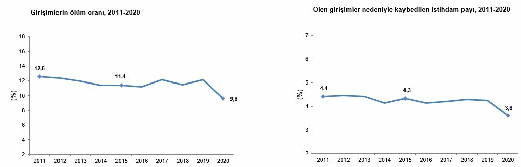 Girişimlerin 2019 yılındaki ölüm oranı %12,1 iken 2020 yılında %9,6’ya düştü. Ölen girişimlerin istihdamdaki payı ise 2019 yılında %4,3 iken 2020 yılında %3,6 olarak gerçekleşti.