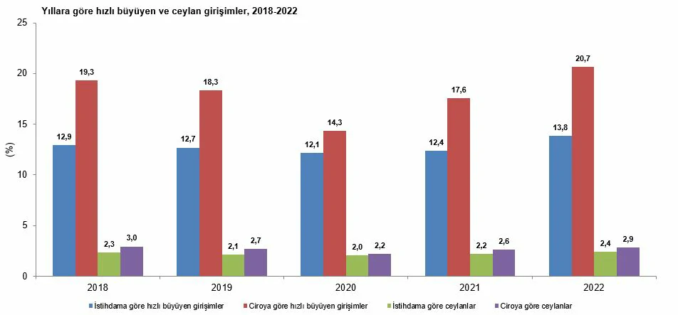 Aynı yıl için ceylan girişimler oranı ise %2,4 oldu. Ciroya göre hızlı büyüyen girişimler oranı 2022 yılında %20,7, ceylan girişimler oranı ise %2,9 oldu.