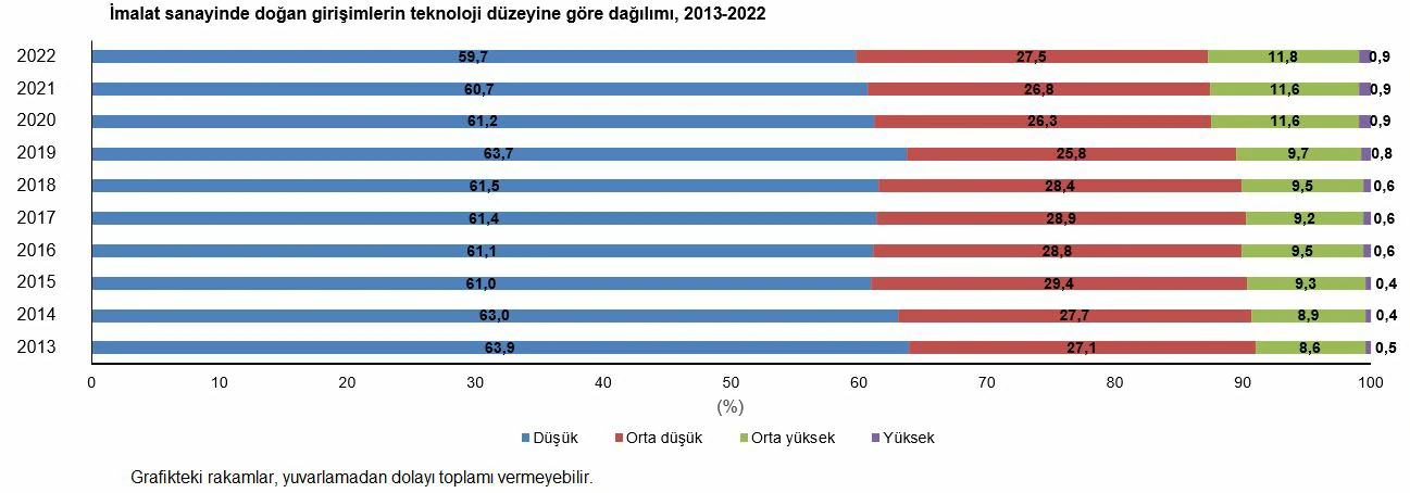 İmalat sanayinde 2022 yılında doğan girişimlerin %27,5’i orta düşük, %11,8’i orta yüksek, %0,9’u ise yüksek teknoloji düzeyine sahip ürünleri üreten girişimler oldu.