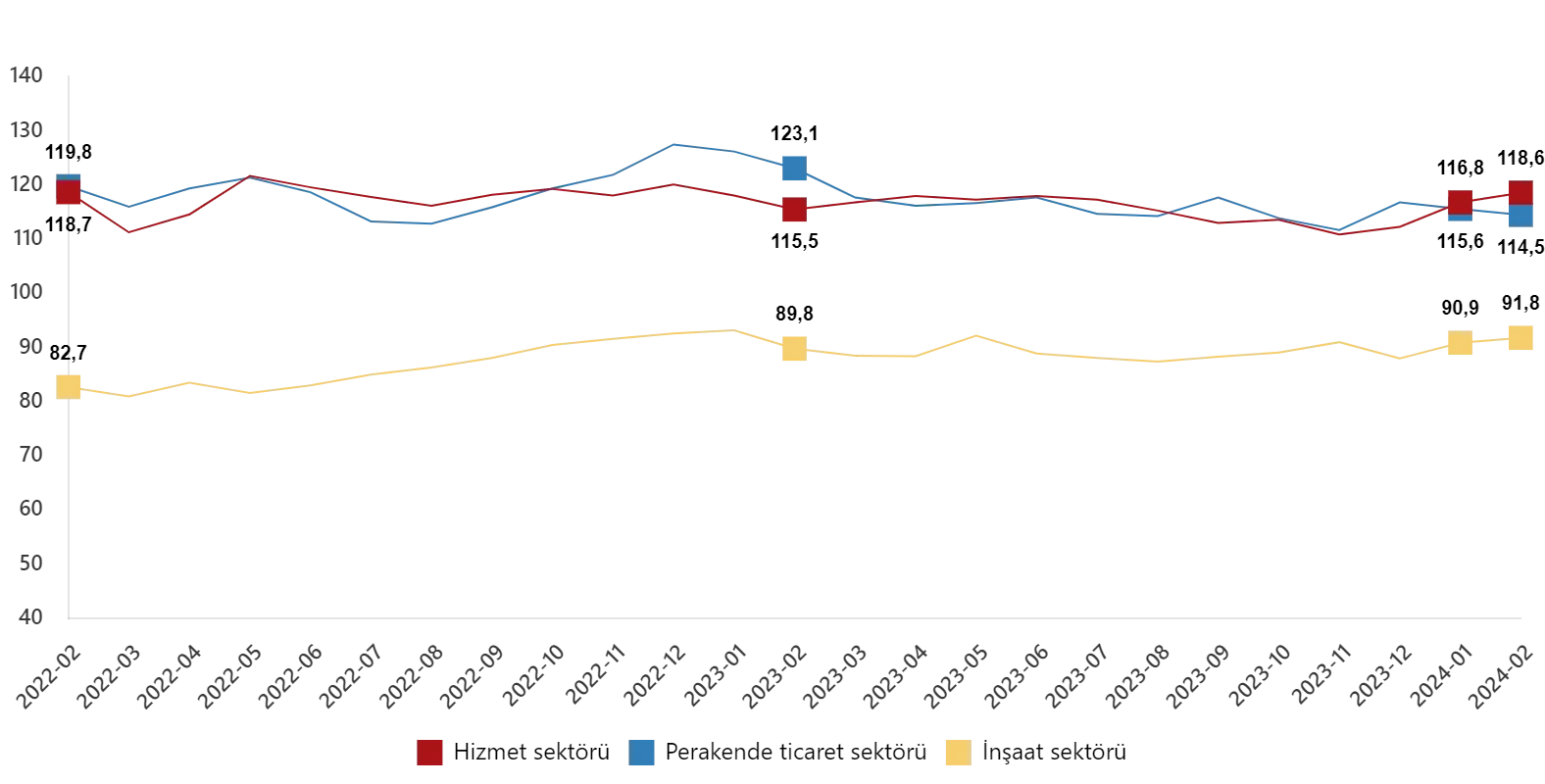 Mevsim etkilerinden arındırılmış güven endeksi Şubat ayında bir önceki aya göre; hizmet sektöründe %1,6 oranında artarak 118,6 değerini, perakende ticaret sektöründe %1,0 oranında azalarak 114,5 değerini ve inşaat sektöründe %1,0 oranında artarak 91,8 değerini aldı.
