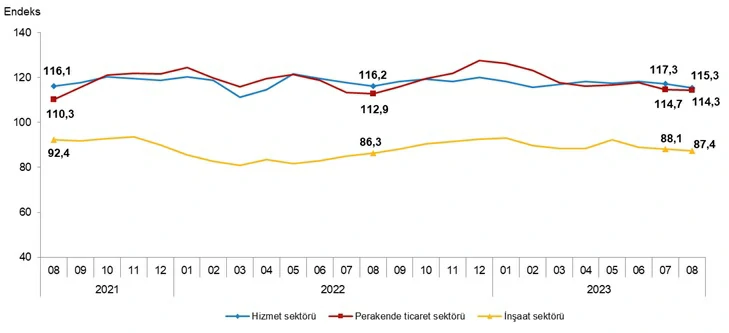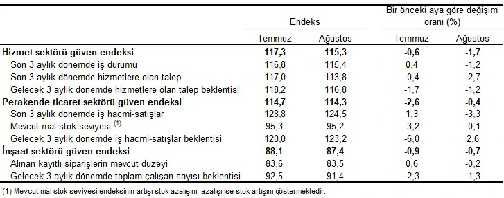 Mevsim etkilerinden arındırılmış güven endeksi Ağustos ayında bir önceki aya göre; hizmet sektöründe %1,7, perakende ticaret sektöründe %0,4, inşaat sektöründe %0,7 azaldı.