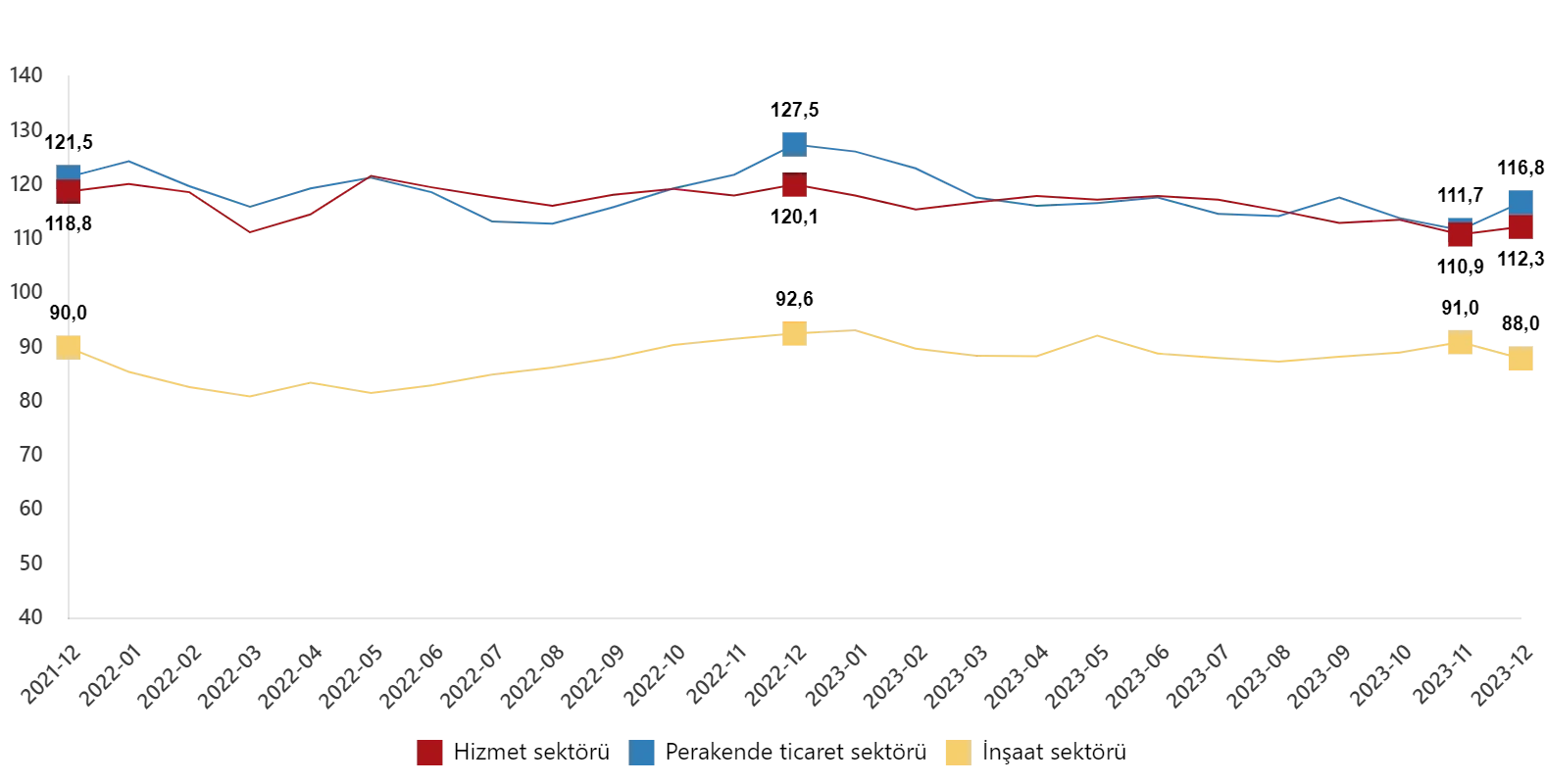 Mevsim etkilerinden arındırılmış güven endeksi Aralık ayında bir önceki aya göre; hizmet sektöründe %1,2 oranında artarak 112,3 değerini, perakende ticaret sektöründe %4,5 oranında artarak 116,8 değerini ve inşaat sektöründe %3,3 oranında azalarak 88,0 değerini aldı.