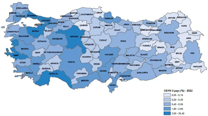 İl düzeyinde cari fiyatlarla GSYH hesaplamalarına göre; 2022 yılında İstanbul 4 trilyon 564 milyar 280 milyon TL ile en yüksek GSYH’ye ulaştı ve toplam GSYH’den %30,4 pay aldı. İstanbul’u, 1 trilyon 329 milyar 810 milyon TL ve %8,9 pay ile Ankara, 972 milyar 238 milyon TL ve %6,5 pay ile İzmir izledi. İl düzeyinde GSYH hesaplarında son üç sırada 11 milyar 288 milyon TL ile Tunceli, 10 milyar 539 milyon TL ile Ardahan ve 8 milyar 287 milyon TL ile Bayburt yer aldı.
