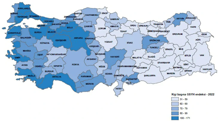 Kişi başına GSYH, 2022 yılında on dört ilde Türkiye ortalamasının üzerinde gerçekleşti.
