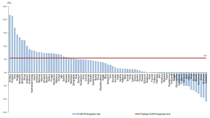 Yıllık GSYH, zincirlenmiş hacim endeksiyle 2022 yılında bir önceki yıla göre %5,5 artarken, 26 ilde Türkiye ortalamasının üzerinde artış gerçekleşti. Bir önceki yıla göre 2022 yılında en yüksek artış gösteren ilk üç il sırasıyla %21,8 değişim oranı ile Antalya, %21,4 ile Kırşehir ve %17,0 ile Kilis oldu. Bir önceki yıla göre en yüksek azalış gösteren üç il ise sırasıyla %9,4 ile Artvin, %9,5 ile Erzincan ve %11,0 değişim oranı ile Karabük oldu.