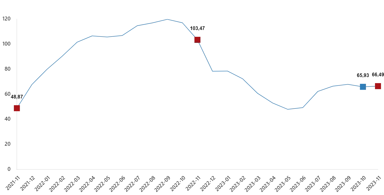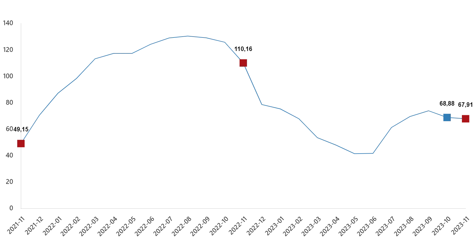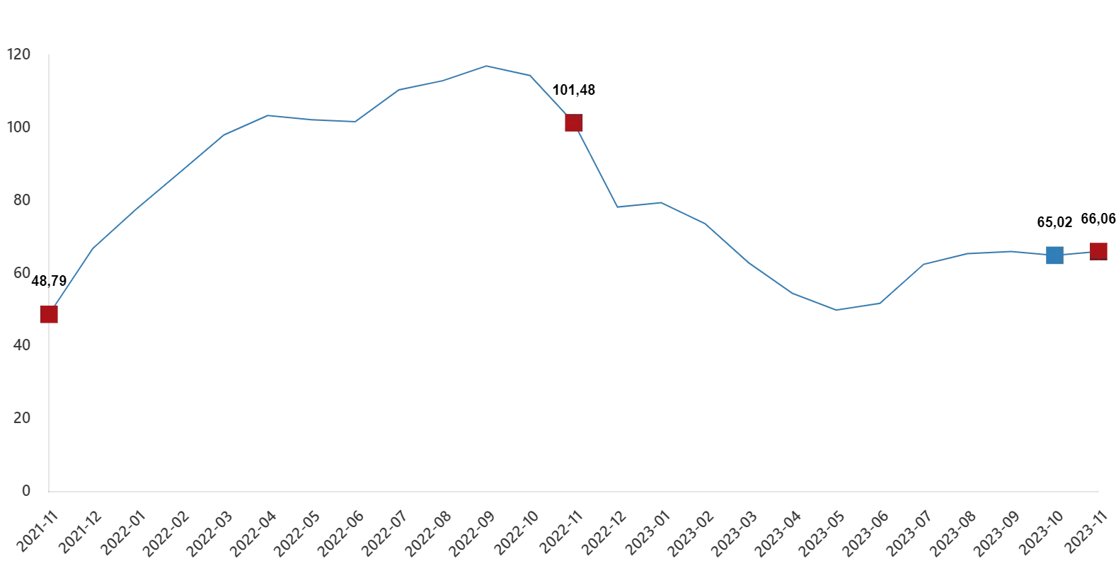 İnşaat maliyet endeksi, 2023 yılı Kasım ayında bir önceki aya göre %1,52 arttı, bir önceki yılın aynı ayına göre %66,49 arttı. Bir önceki aya göre malzeme endeksi %2,06 arttı, işçilik endeksi %0,19 arttı. Ayrıca bir önceki yılın aynı ayına göre malzeme endeksi %53,46 arttı, işçilik endeksi %110,77 arttı.
