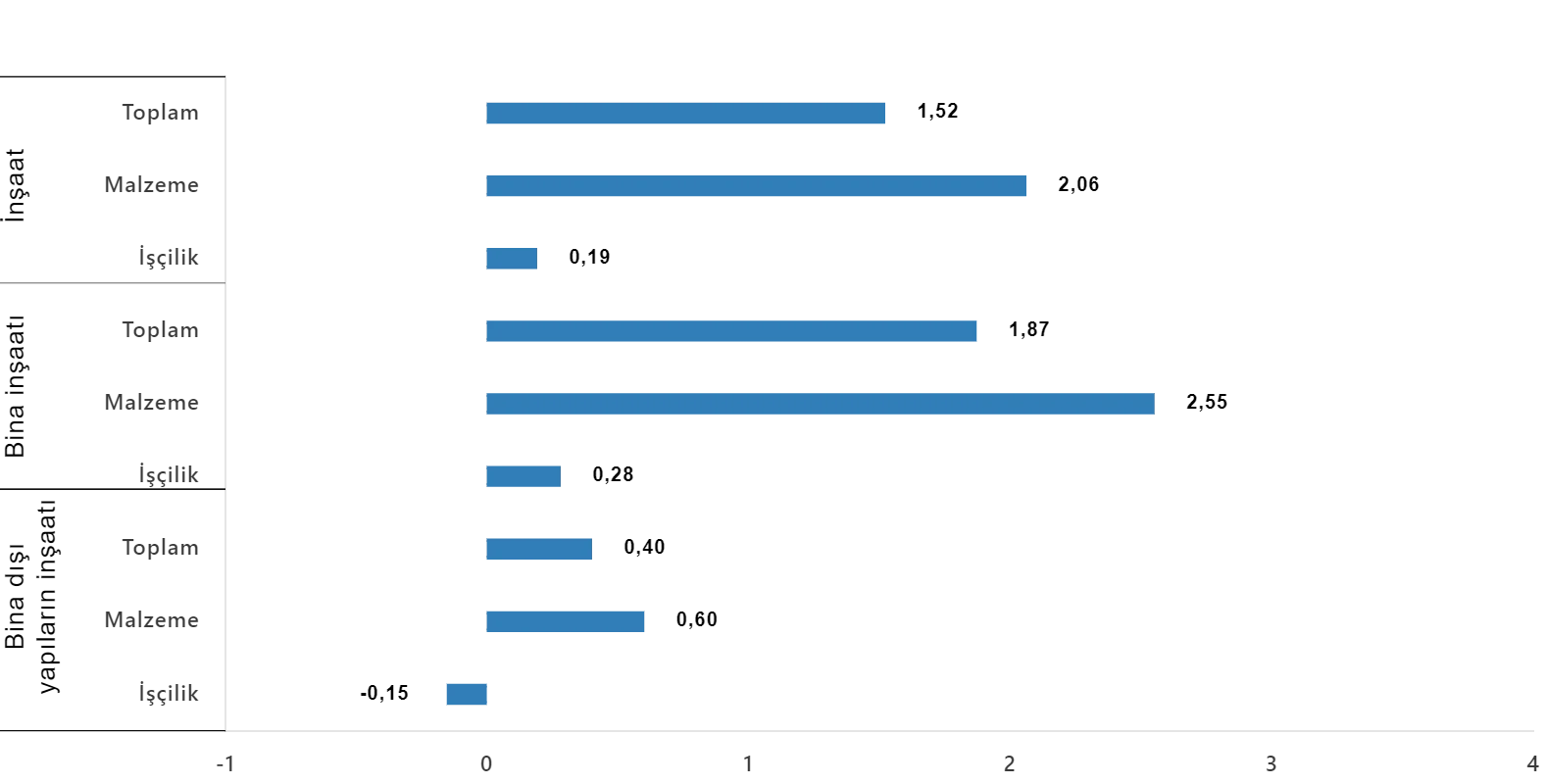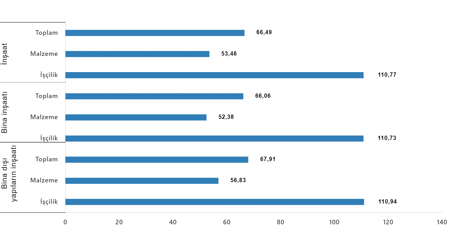 Bina dışı yapılar için inşaat maliyet endeksi, bir önceki aya göre %0,40 arttı, bir önceki yılın aynı ayına göre %67,91 arttı. Bir önceki aya göre malzeme endeksi %0,60 arttı, işçilik endeksi %0,15 azaldı. Ayrıca bir önceki yılın aynı ayına göre malzeme endeksi %56,83 arttı, işçilik endeksi %110,94 arttı.