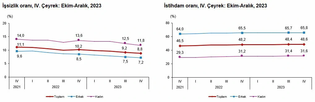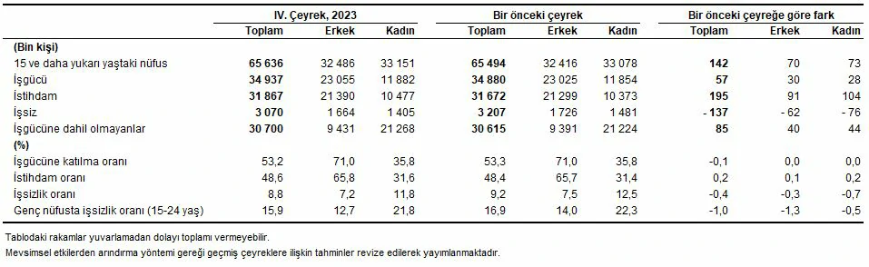Hanehalkı İşgücü Araştırması sonuçlarına göre; 15 ve daha yukarı yaştaki kişilerde işsiz sayısı 2023 yılı IV. çeyreğinde bir önceki çeyreğe göre 137 bin kişi azalarak 3 milyon 70 bin kişi oldu. İşsizlik oranı ise 0,4 puanlık azalış ile %8,8 seviyesinde gerçekleşti. İşsizlik oranı erkeklerde %7,2, kadınlarda %11,8 olarak tahmin edildi.