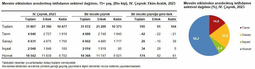 Mevsim etkisinden arındırılmış istihdam edilenlerin sayısı 2023 yılı IV. çeyreğinde bir önceki çeyreğe göre tarım sektöründe 42 bin kişi azalırken, sanayi sektöründe 29 bin kişi, inşaat sektöründe 34 bin kişi, hizmet sektöründe 174 bin kişi arttı. İstihdam edilenlerin %14,6’sı tarım, %20,8’i sanayi, %6,4’ü inşaat, %58,2’si ise hizmet sektöründe yer aldı.