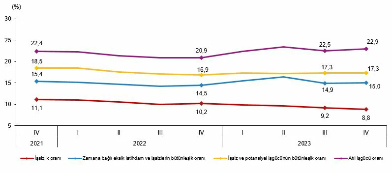 Zamana bağlı eksik istihdam, potansiyel işgücü ve işsizlerden oluşan atıl işgücü oranı 2023 yılı IV. çeyreğinde bir önceki çeyreğe göre 0,4 puanlık artış ile %22,9 oldu. Zamana bağlı eksik istihdam ve işsizlerin bütünleşik oranı %15,0 iken potansiyel işgücü ve işsizlerin bütünleşik oranı %17,3 olarak tahmin edildi.