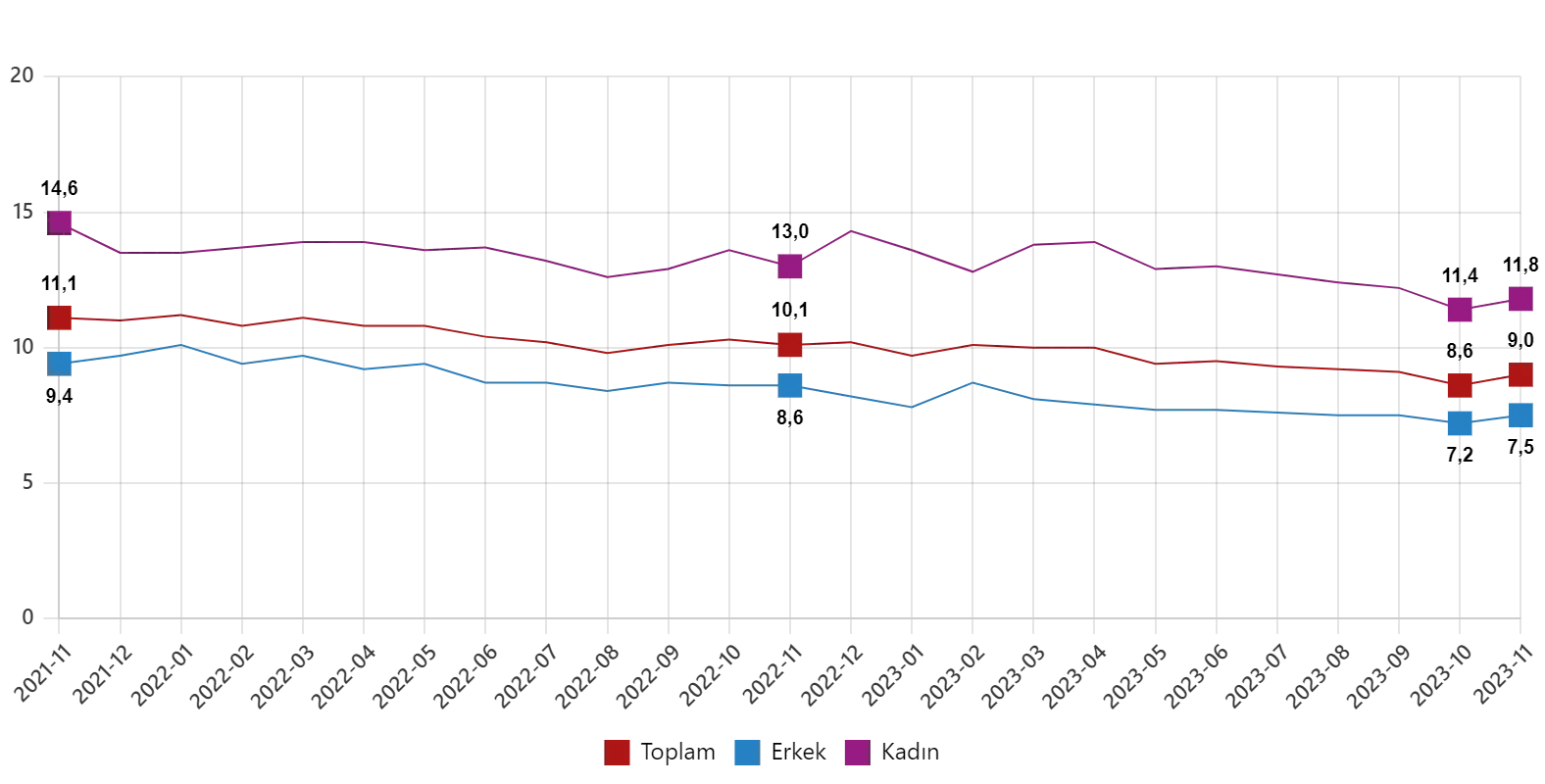 Mevsim etkisinden arındırılmış işsizlik oranı, Kasım 2021 – Kasım 2023