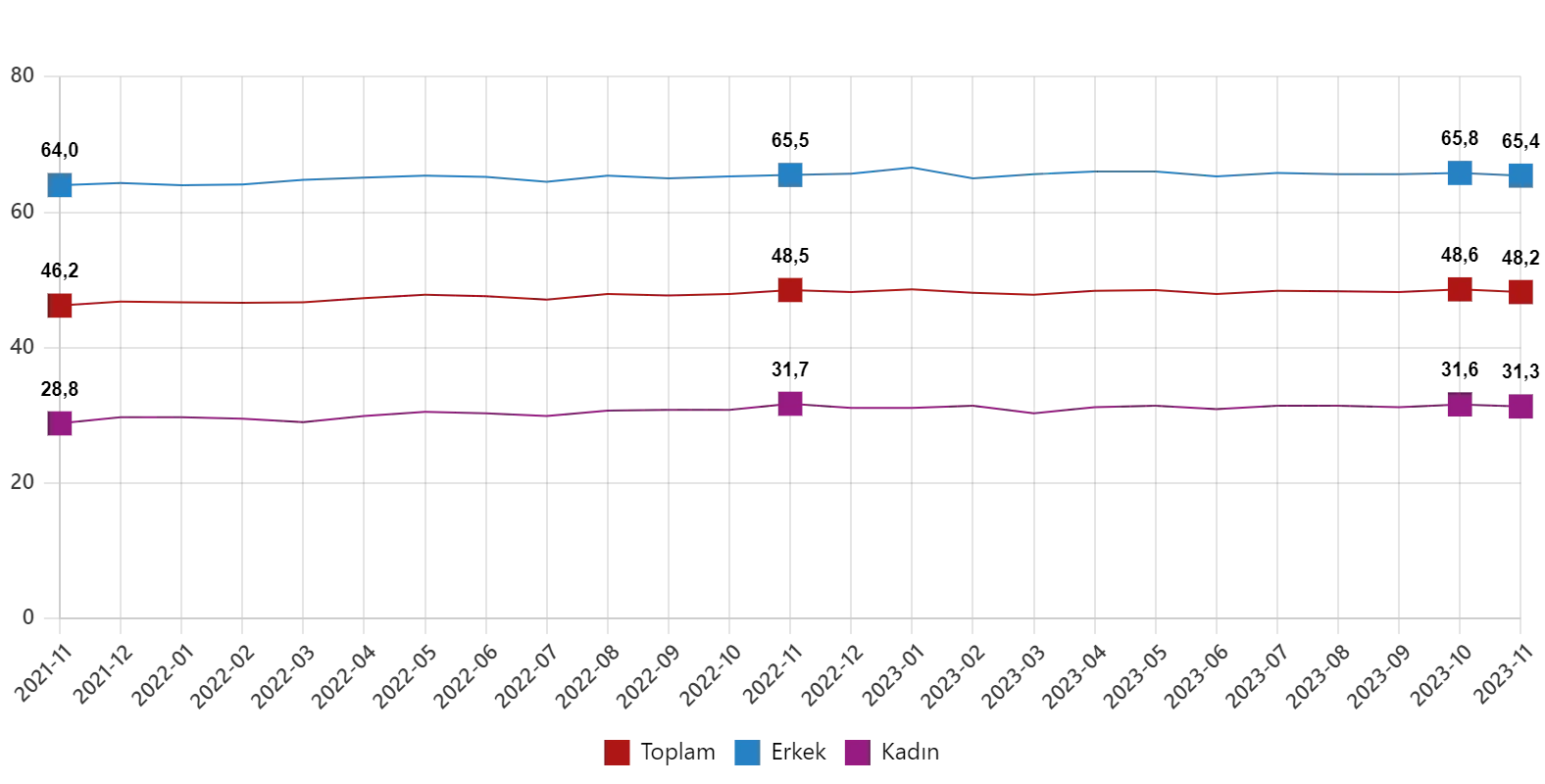 İşgücü 2023 yılı Kasım ayında bir önceki aya göre 122 bin kişi azalarak 34 milyon 726 bin kişi, işgücüne katılma oranı ise 0,2 puan azalarak %52,9 olarak gerçekleşti. İşgücüne katılma oranı erkeklerde %70,7 iken kadınlarda %35,5 oldu.