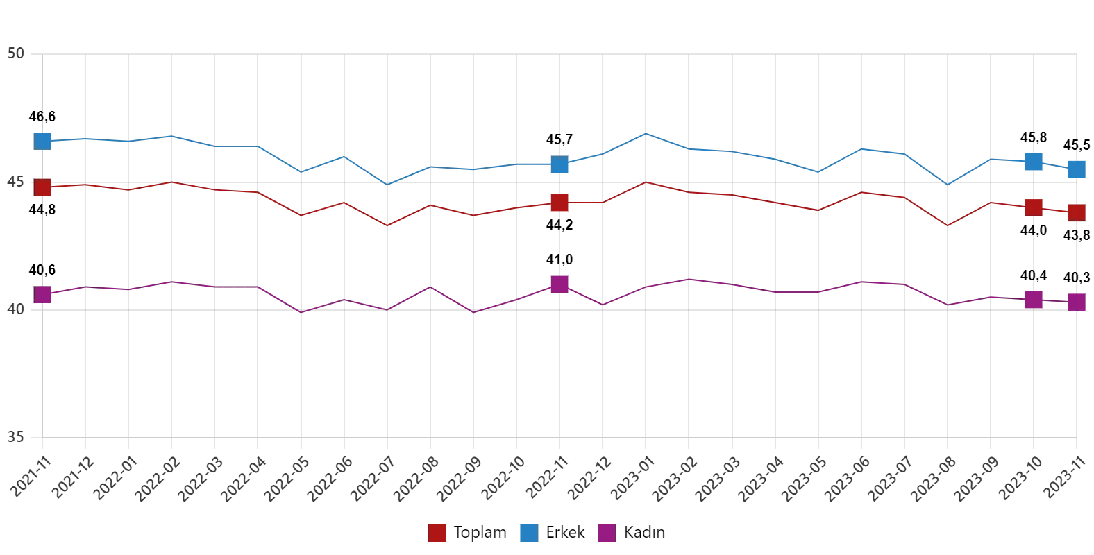 Mevsim ve takvim etkilerinden arındırılmış haftalık ortalama fiili çalışma süresi, Kasım 2021 – Kasım 2023