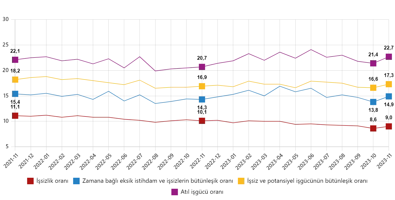 Zamana bağlı eksik istihdam, potansiyel işgücü ve işsizlerden oluşan atıl işgücü oranı 2023 yılı Kasım ayında bir önceki aya göre 1,3 puan artarak %22,7 oldu. Zamana bağlı eksik istihdam ve işsizlerin bütünleşik oranı %14,9 iken işsiz ve potansiyel işgücünün bütünleşik oranı %17,3 olarak tahmin edildi.