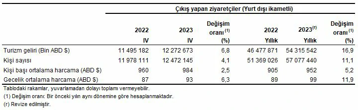 Ülkemizden çıkış yapan ziyaretçi sayısı 2023 yılında bir önceki yıla göre %11,1 artarak 57 milyon 77 bin 440 kişi oldu. Bunların %13,5’ini 7 milyon 730 bin 473 kişi ile yurt dışında ikamet eden vatandaşlar oluşturdu.