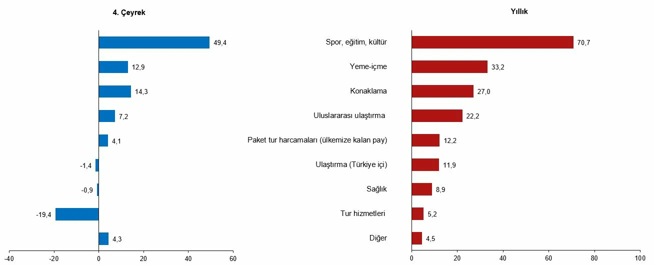 Yıllık olarak değerlendirildiğinde; turizm gideri, geçen yıla göre %65,3 artarak 7 milyar 68 milyon 901 bin dolar oldu. Bunun 5 milyar 916 milyon 935 bin dolarını kişisel, 1 milyar 151 milyon 967 bin dolarını ise paket tur harcamaları oluşturdu.