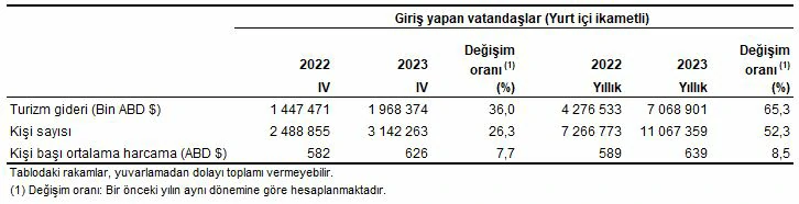 Turizm gideri ve yurt dışını ziyaret eden vatandaş sayısı, IV. Çeyrek: Ekim-Aralık, 2023
