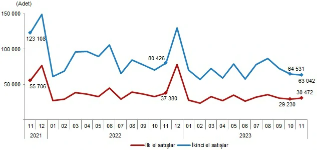 Türkiye genelinde ikinci el konut satışları Kasım ayında bir önceki yılın aynı ayına göre %21,6 azalış göstererek 63 bin 42 oldu. Toplam konut satışları içinde ikinci el konut satışının payı %67,4 oldu. İkinci el konut satışları Ocak-Kasım döneminde ise bir önceki yılın aynı dönemine göre %15,2 azalışla 759 bin 50 olarak gerçekleşti.