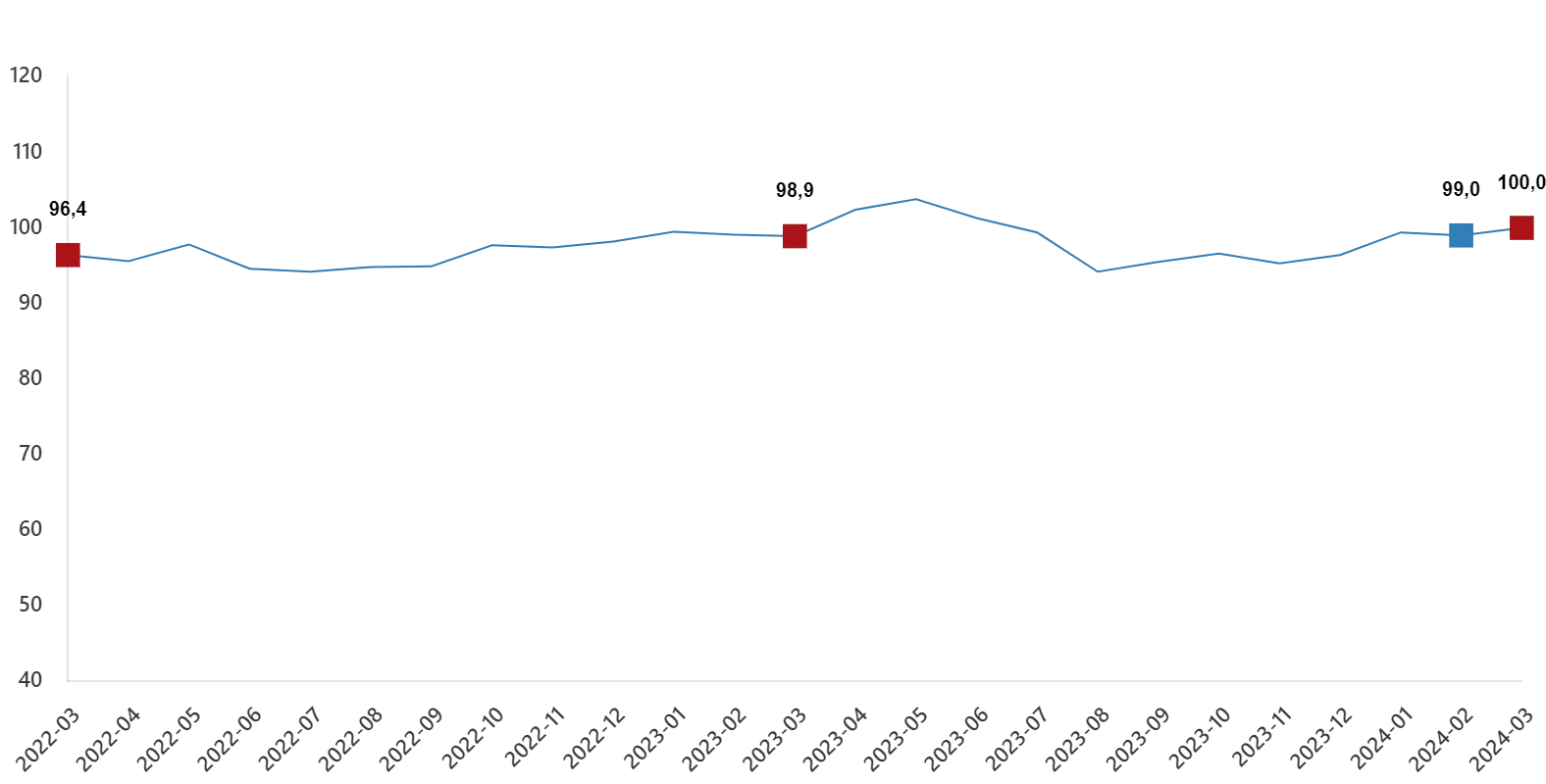 Ekonomik güven endeksi, güven endeksleri ve değişim oranları, Mart 2024