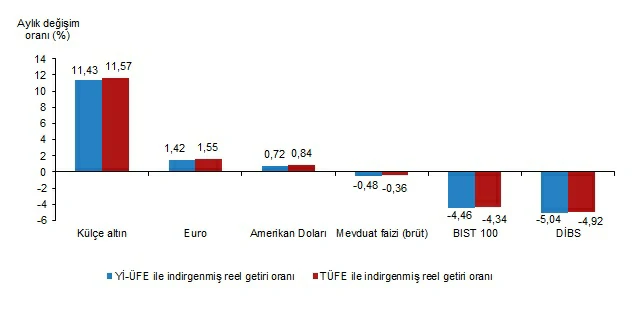 Aylık en yüksek reel getiri, yurt içi üretici fiyat endeksi (Yİ-ÜFE) ile indirgendiğinde %11,43, tüketici fiyat endeksi (TÜFE) ile indirgendiğinde ise %11,57 oranlarıyla külçe altında gerçekleşti.
