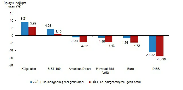 Külçe altın, üç aylık değerlendirmede; Yİ-ÜFE ile indirgendiğinde %9,21, TÜFE ile indirgendiğinde ise %5,92 oranlarında yatırımcısına en yüksek reel getiri sağlayan yatırım aracı oldu. Aynı dönemde DİBS, Yİ-ÜFE ile indirgendiğinde %11,32, TÜFE ile indirgendiğinde ise %13,99 oranlarında yatırımcısına en çok kaybettiren yatırım aracı oldu.