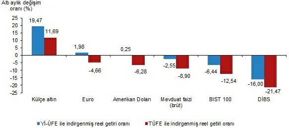 Altı aylık değerlendirmeye göre külçe altın; Yİ-ÜFE ile indirgendiğinde %19,47, TÜFE ile indirgendiğinde ise %11,69 oranlarında yatırımcısına en yüksek reel getiri sağlayan yatırım aracı olurken; aynı dönemde DİBS, Yİ-ÜFE ile indirgendiğinde %16,00, TÜFE ile indirgendiğinde ise %21,47 oranlarında yatırımcısına en çok kaybettiren yatırım aracı oldu.