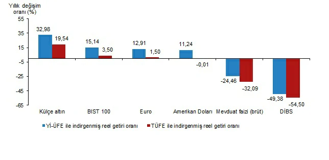 Finansal yatırım araçları yıllık olarak değerlendirildiğinde külçe altın; Yİ-ÜFE ile indirgendiğinde %32,98, TÜFE ile indirgendiğinde ise %19,54 oranlarında yatırımcısına en yüksek reel getiri sağlayan yatırım aracı oldu.