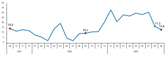 Sabit fiyatlarla perakende satış hacmi (2015=100) 2023 yılı Eylül ayında bir önceki yılın aynı ayına göre %13,8 arttı. Aynı ayda gıda, içecek ve tütün satışları %13,8, gıda dışı satışlar (otomotiv yakıtı hariç) %18,6 arttı, otomotiv yakıtı satışları ise %1,5 azaldı.