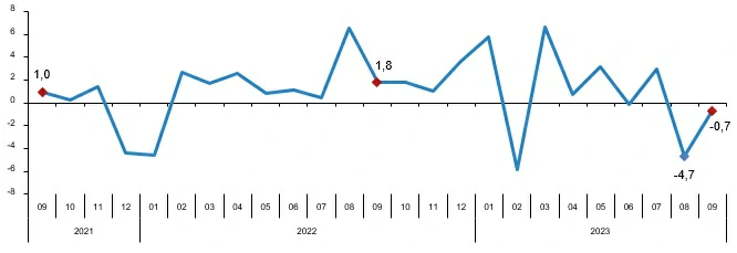 Sabit fiyatlarla perakende satış hacmi (2015=100) 2023 yılı Eylül ayında bir önceki aya göre %0,7 azaldı. Aynı ayda gıda, içecek ve tütün satışları aynı seviyede kaldı, gıda dışı satışlar (otomotiv yakıtı hariç) %1,2 azaldı, otomotiv yakıtı satışları ise %0,1 arttı.