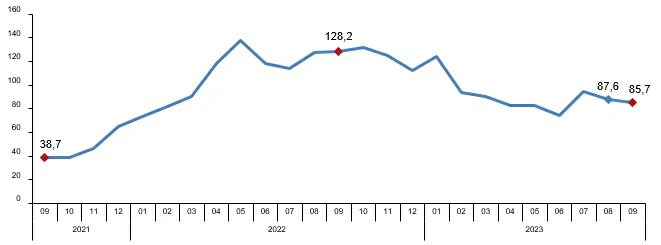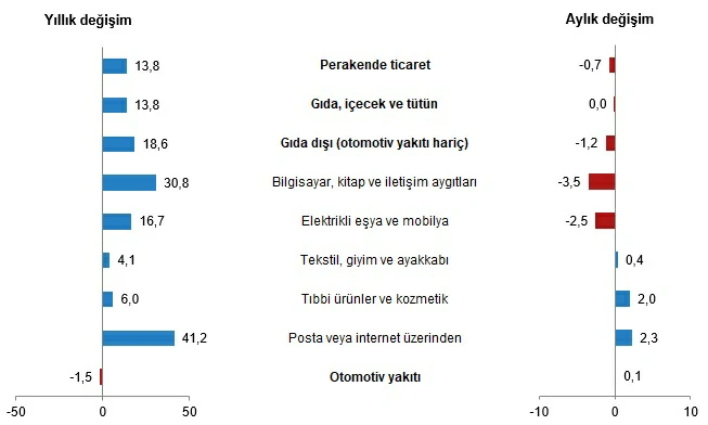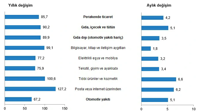 Cari fiyatlarla perakende ciro (2015=100) 2023 yılı Eylül ayında bir önceki yılın aynı ayına göre %85,7 arttı. Aynı ayda gıda, içecek ve tütün satışları %90,2, gıda dışı satışlar (otomotiv yakıtı hariç) %89,9, otomotiv yakıtı satışları ise %67,2 arttı.