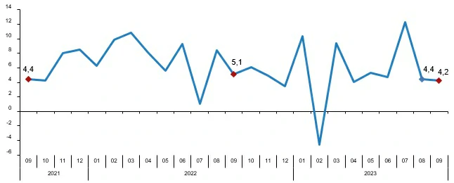 Cari fiyatlarla perakende ciro (2015=100) 2023 yılı Eylül ayında bir önceki aya göre %4,2 arttı. Aynı ayda gıda, içecek ve tütün satışları %5,1, gıda dışı satışlar (otomotiv yakıtı hariç) %3,5, otomotiv yakıtı satışları ise %5,1 arttı.