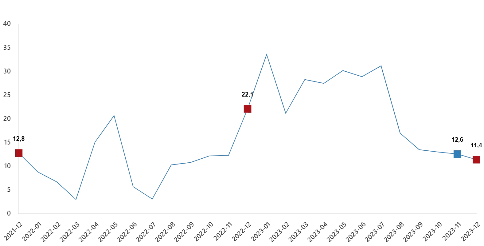 Perakende satış hacmi yıllık değişim oranı(%), Aralık 2023